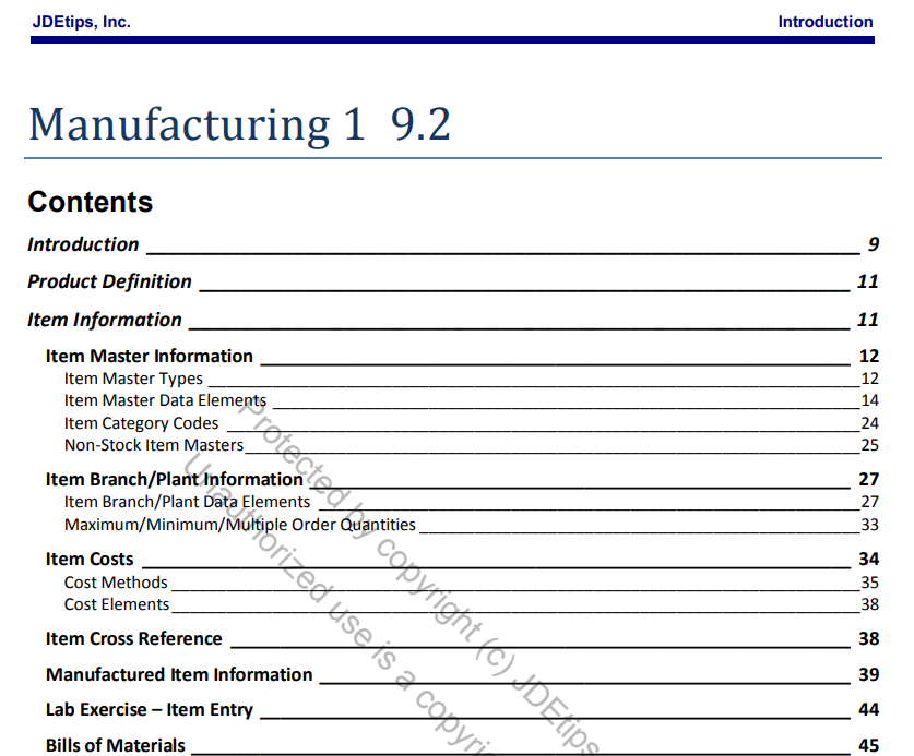 This course is a complete review of the Manufacturing applications in JD Edwards. You will gain a working knowledge of how to set up Manufacturing, Item/Master and Item/Branch set up, Product Definition, Shop Floor Management, basic MRP, Bills of Materials, Routings and Work Orders.